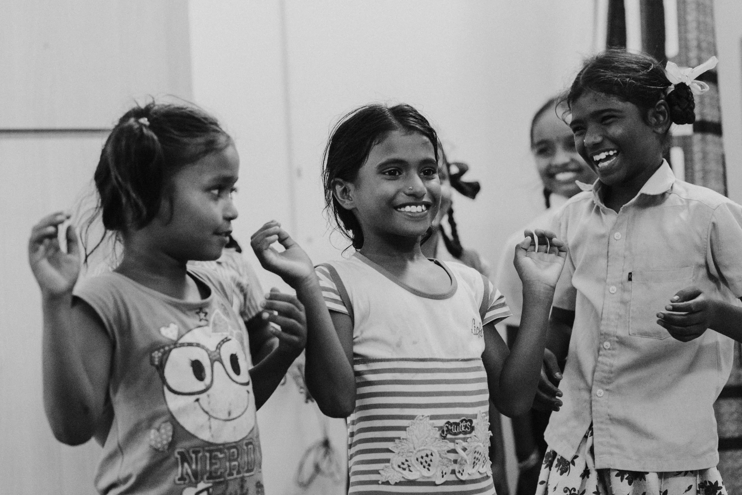 Young girls, eyes alight with mischief and dreams, press close—braids unraveling, bangles clinking, henna-darkened palms tracing secret messages of joy onto each other's skin.